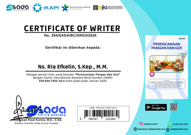 S.Kep., M.M, Ns.Ria Sertfikat Buku Pangan dan Gizi. Sekolah Tinggi Ilmu Kesehatan RS Husada. (Submitted)